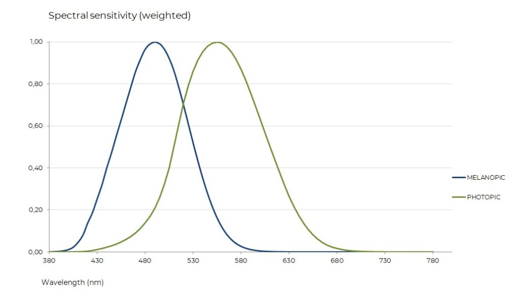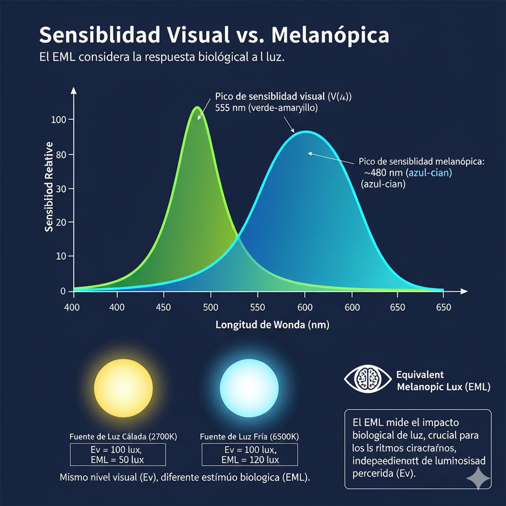 Aunque dos fuentes luminosas puedan proporcionar el mismo nivel visual (Ev = 100 lux), su respuesta melanópica (Emel) puede variar considerablemente según su composición espectral. Esto se debe a que la sensibilidad melanópica —centrada en la zona azul-cian del espectro— no coincide con la sensibilidad visual, cuyo pico se encuentra en 555 nm.